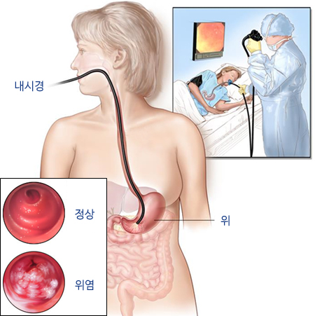 우리나라에서는 전체 암 중에서도 위암의 발생률이 가장 높기 때문에 위내시경검사를 정기적으로 받아보시는 것이 좋습니다. 위에는 감각신경이 없어 위 질환이 생겨도 초기에 증상을 느끼지 못하는 경우가 많습니다. 명치 부근의 통증, 소화불량, 복부 팽만감, 식욕부진, 구토 등의 증상은 위염뿐만 아니라 위궤양, 위암 등에서도 나타날 수 있으므로, 증상만 가지고 위 질환을 구별하여 진단하는 것은 정확하지 않습니다.